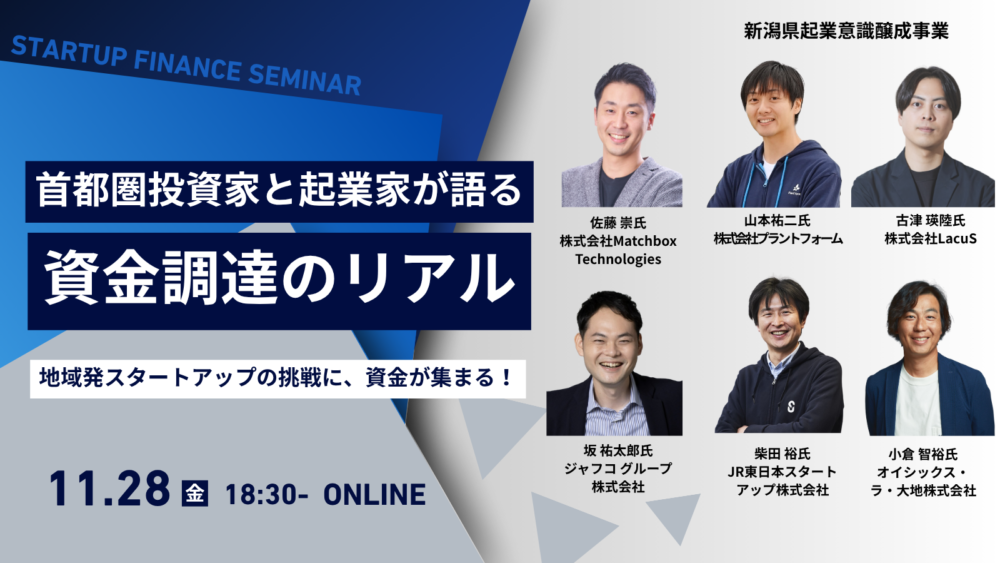 新潟でも、首都圏のベンチャーキャピタル等から資金調達を実現するスタートアップが着実に増えています。本セミナーでは、JR東日本スタートアップの柴田氏、JAFCOの坂氏、オイシックスの小倉氏といった投資側のキーパーソンに加え、実際に資金調達を果たした新潟発スタートアップの起業家をゲストに迎えます。投資家と起業家、それぞれの視点から「なぜ投資が動いたのか」「どのように信頼を築いたのか」を紐解き、“地域にいても資金が集まる時代”の成功条件を明らかにします。新潟で起業を目指す方、さらなる成長を志す起業家の皆様、ぜひご参加ください。
