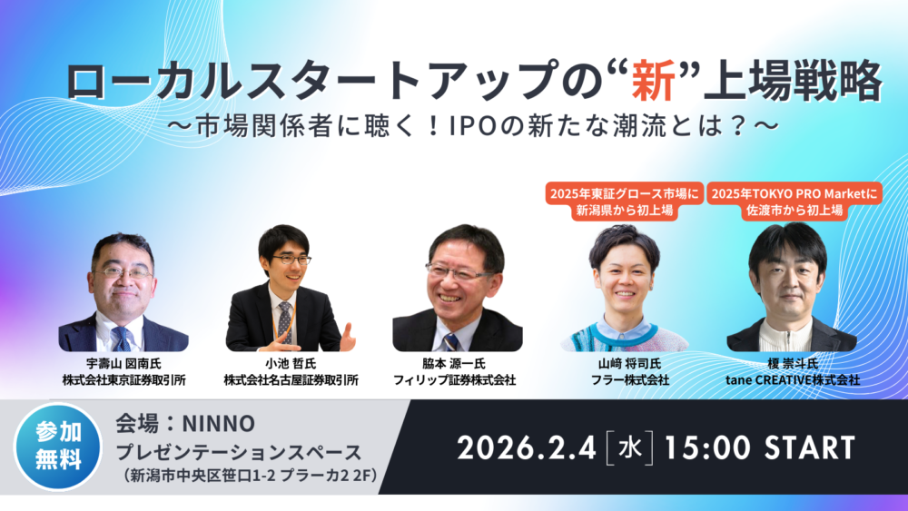 スタートアップを取り巻くIPO環境は今、大きく変化しています。東京証券取引所によるグロース市場の見直しが進む一方で、TOKYO PRO Marketの活用や地方市場への上場など、その手法は多様化しています。本イベントでは、これら市場環境の最新動向について、東京証券取引所・名古屋証券取引所・フィリップ証券をゲストに迎え、詳しく読み解きます。さらに、新潟から上場を果たしたフラー株式会社、tane CREATIVE株式会社の経営者が登壇。IPOの経験談も交えながら、ローカルスタートアップが描くべき「次世代の上場戦略」を考えます。トークイベント終了後は立食形式の交流会も開催します。情報とネットワークを同時に得られる絶好の機会です。起業家や支援者はもちろん、これから起業を目指す方、ローカルスタートアップに関心のある方はぜひご参加ください!